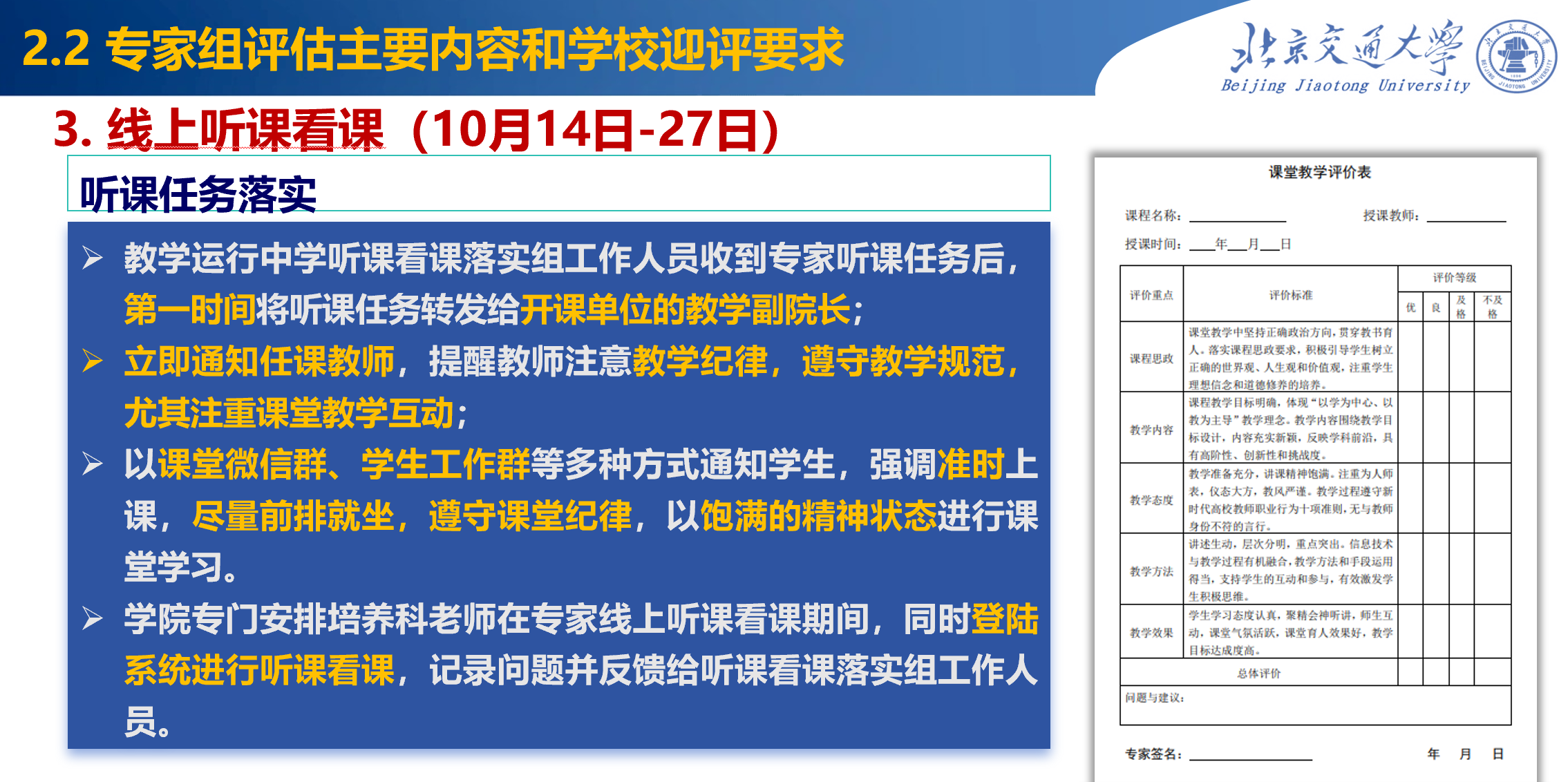 李静详细介绍了公司迎评工作的主要任务,重点强调了线上评估期间相关材料调阅、座谈访谈、在线听课及专家入校考察期间公司的工作安排及要求。